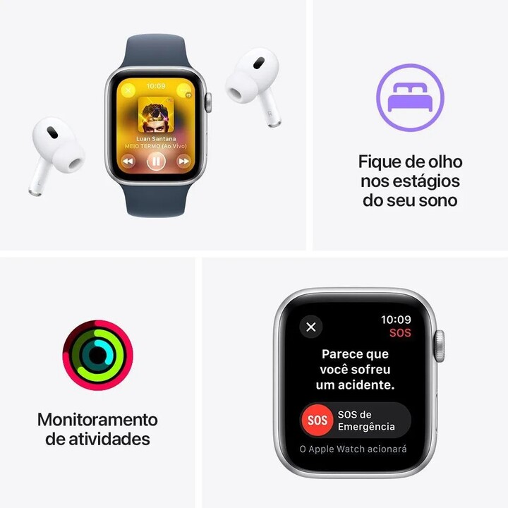 Todos os recursos essenciais para você se movimentar, manter a conexão, monitorar sua saúde e ficar em segurança. O Conjunto Inteligente e os apps redesenhados no watchOS 10 mostram mais informações num instante. Com Detecção de Acidente (1) e métricas de treino aprimoradas, o Apple Watch SE é cheio de possibilidades ao alcance do seu pulso.
