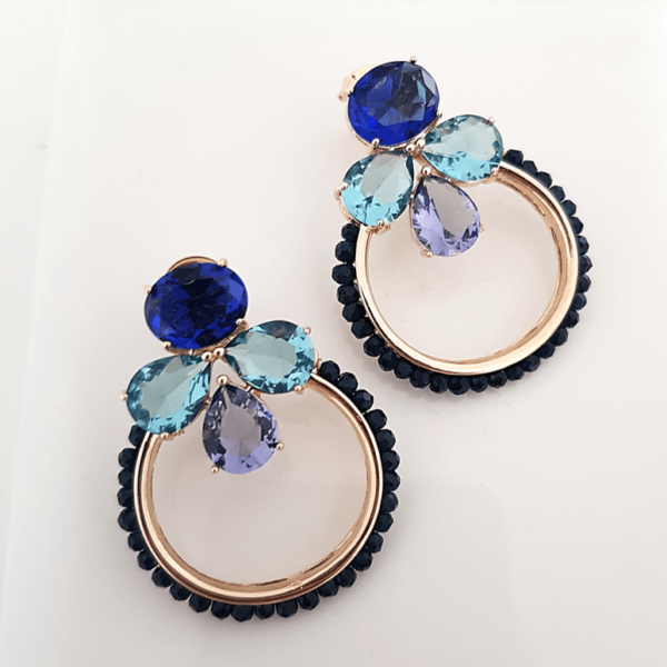 Brinco com cristais azul safira, lavanda e azul aquamarine, e argola frontal bordado com cristais rondel azul safira.