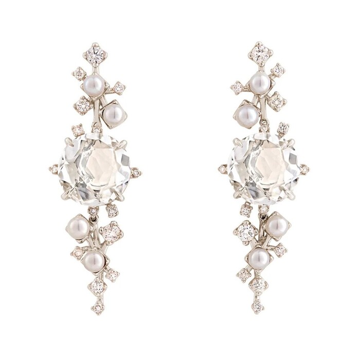 Brincos de Ouro Nobre 18K com cristais de rocha, pérolas e diamantes cognac.