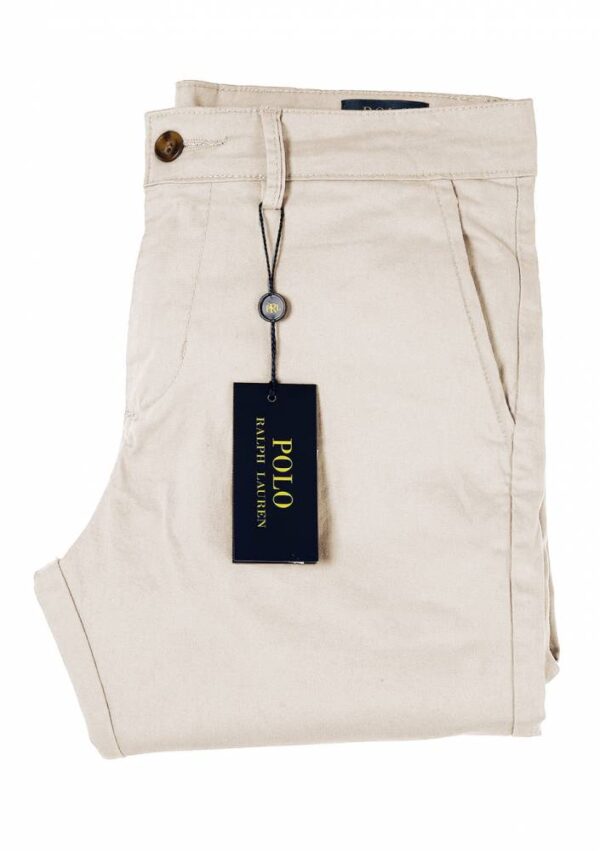 Calça de sarja da marca Ralph Lauren na cor areia.