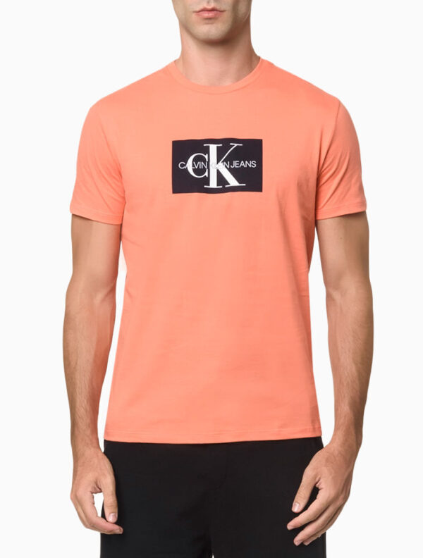 Camiseta Calvin Klein Jeans Masculina Manga Curta De Meia Malha, Gola Ribana, Estampa Frontal E Lavanderia Exclusiva Da Marca. Modelagem Básica.