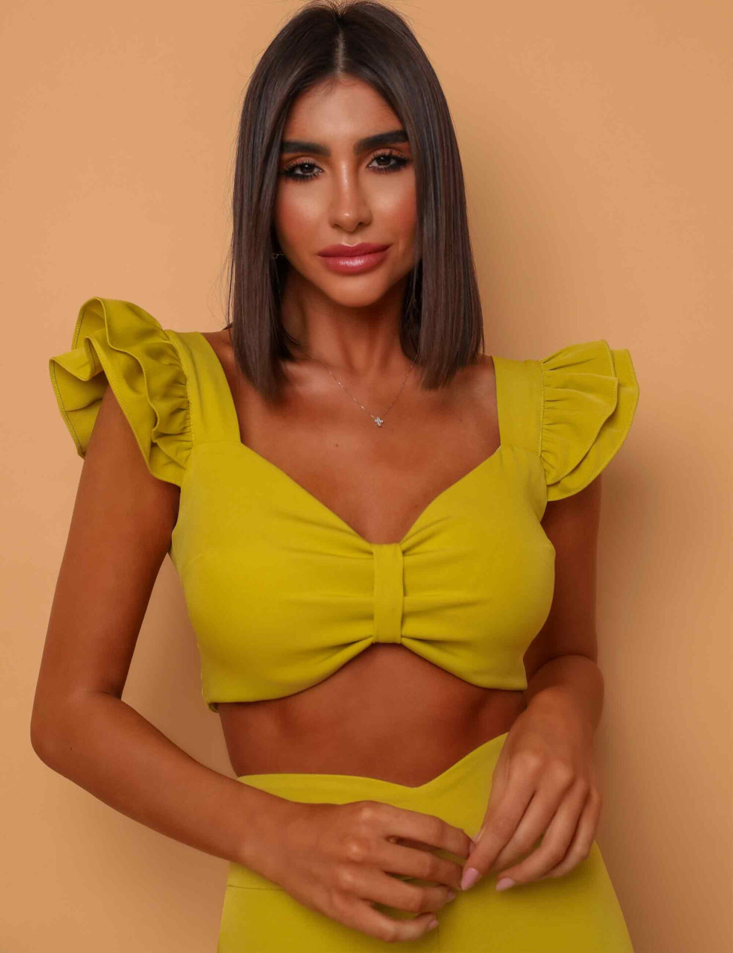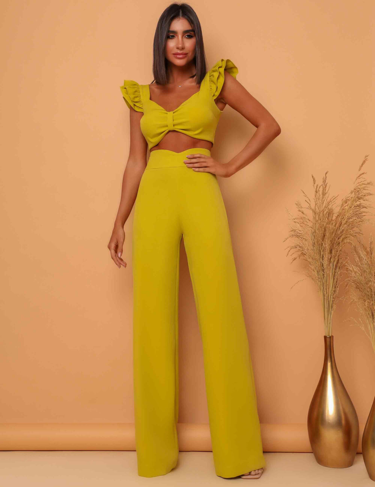 Conjunto lindo e moderno feito em tecido de alfaiataria que deixa o look ainda mais chique e nobre, com top de manga babado e detalhe nó no busto com calça pantalona de com detalhe arco no cós que deixou a peça ainda mais deslumbrante.