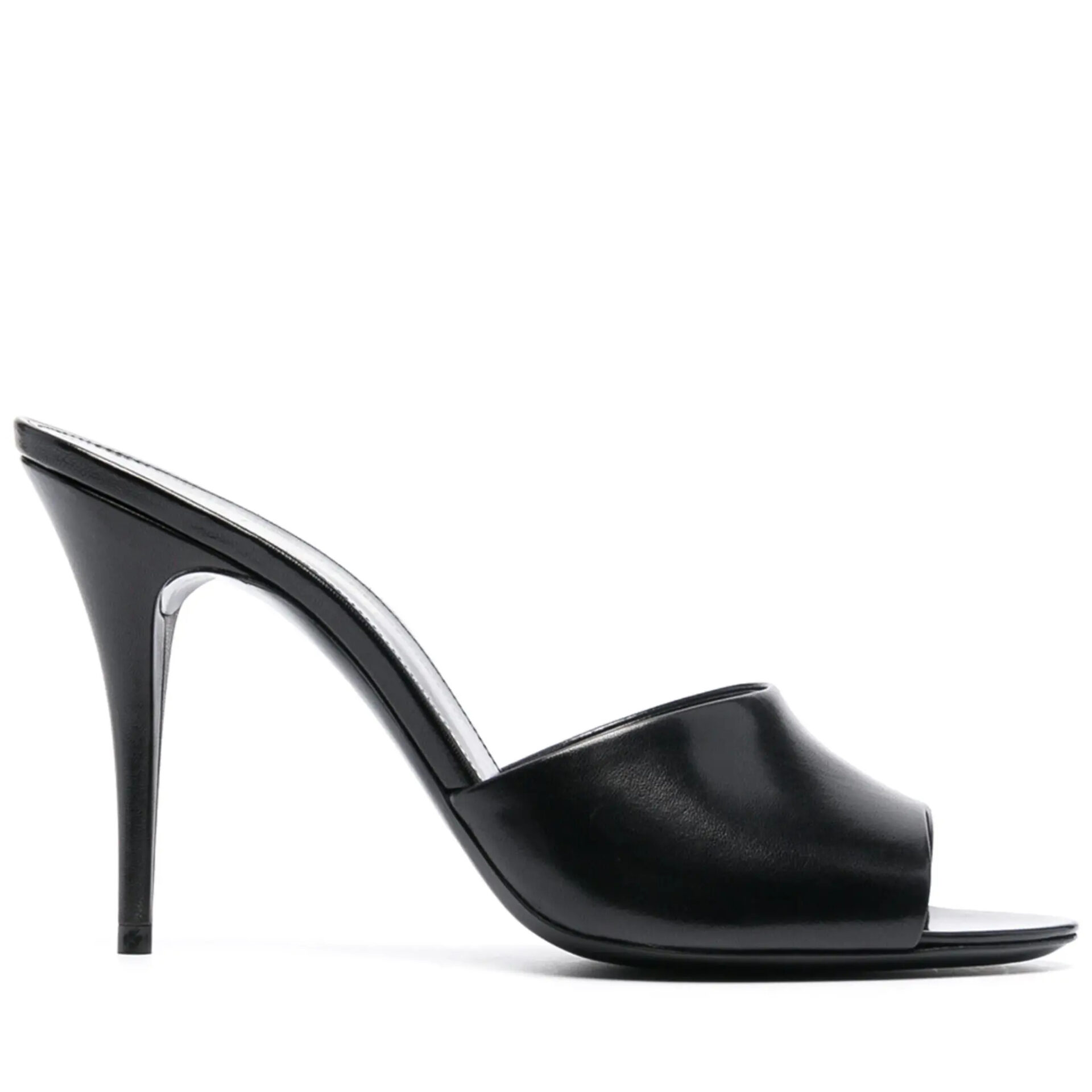 Peep toe, logo na palmilha e salto agulha. Material: couro. Cor: Preto.