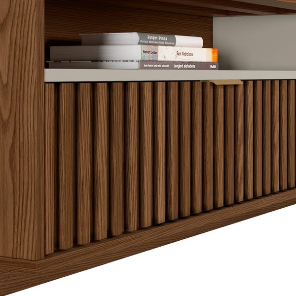O Painel Home Araruna veio para encantar! Seu painel com detalhes ripado deixa sua sala ainda mais sofisticada. O Painel Home Araruna conta com duas portas basculantes com pistão a gás e puxador metálico, nichos para aparelhos eletrônicos e prateleiras para decoração. Possui espaço para TV de até 65 polegadas. Sua sala ficará mais completa com o Painel Home Araruna.