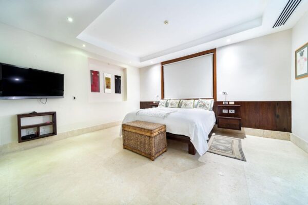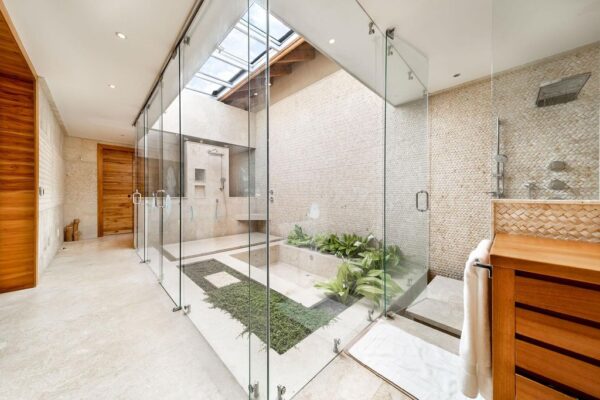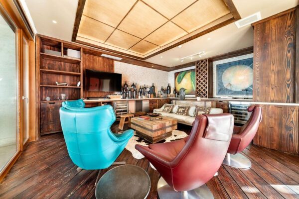 O quarto principal conta com um incrível espaço de banheiro, jacuzzi e uma vista incrível para a marina. Enquanto outro quarto e uma academia com sauna a vapor ficam no andar superior.