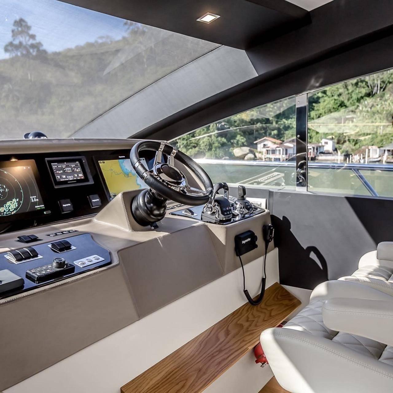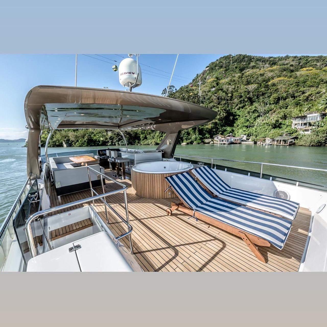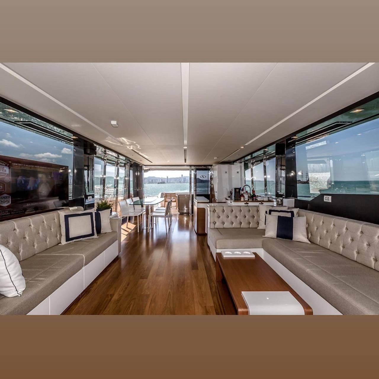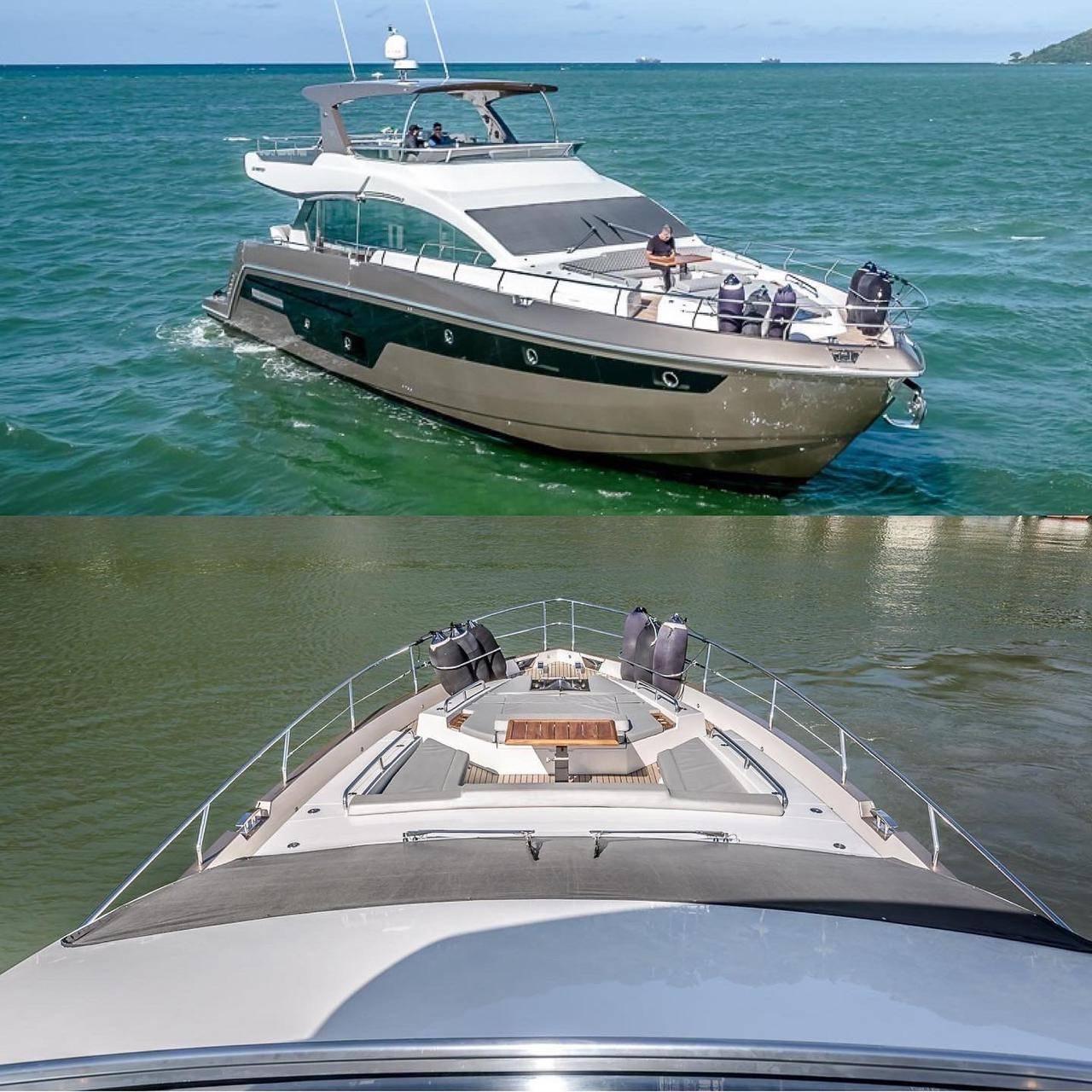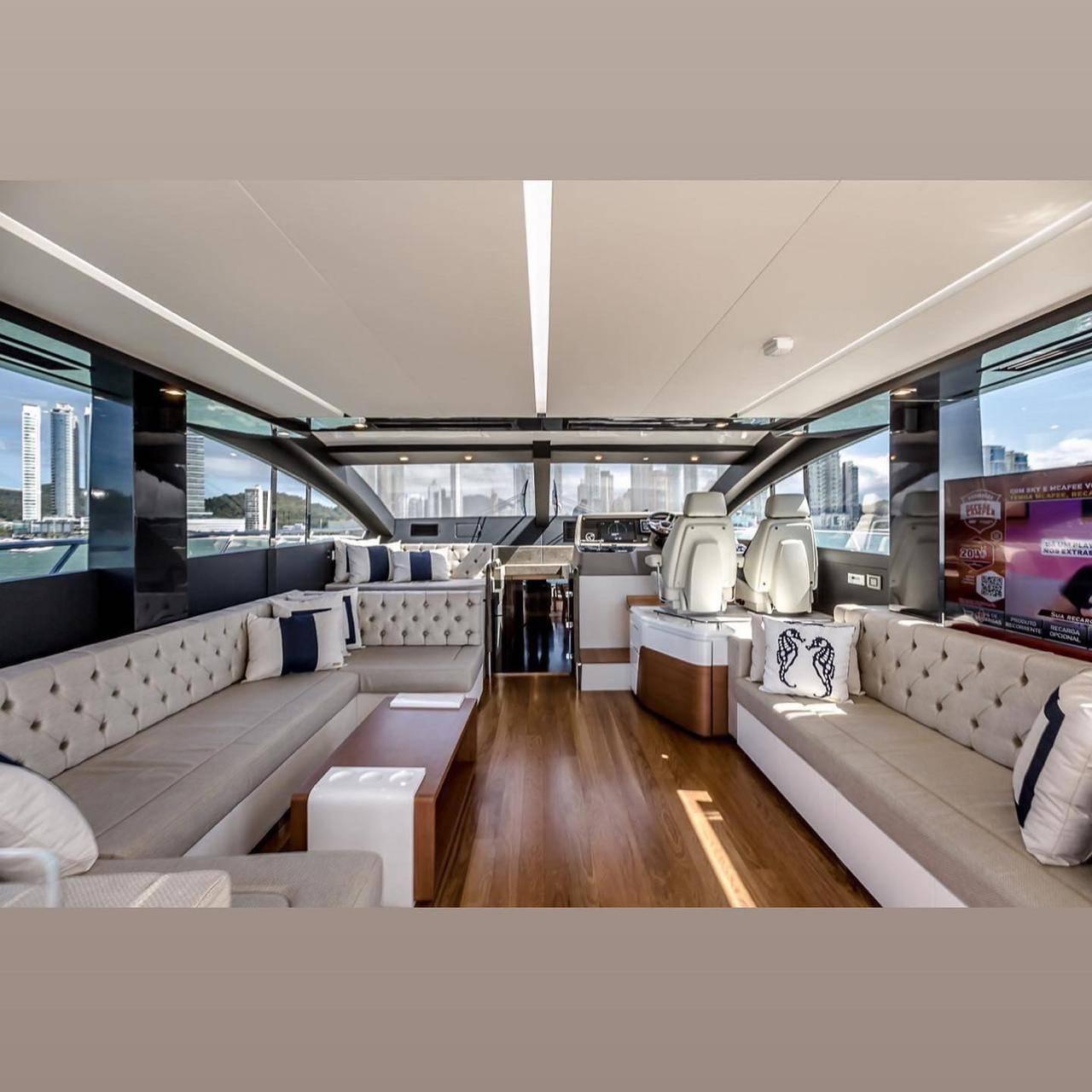 Personalizada na cor Bege Dakar com Trinca 3 Motores Volvo Penta IPS 950 com apenas 120 Horas Totais com Sistema de Revisões Programadas Volvo Ativo Configurada com 4 Camarotes Todas Suítes Fly com Área Gourmet e Jacuzzi, 2 Estabilizadores MC2 X16, Capa c/ Fechamento Total, Todos os Opcionais Possíveis pra este modelo de Fábrica